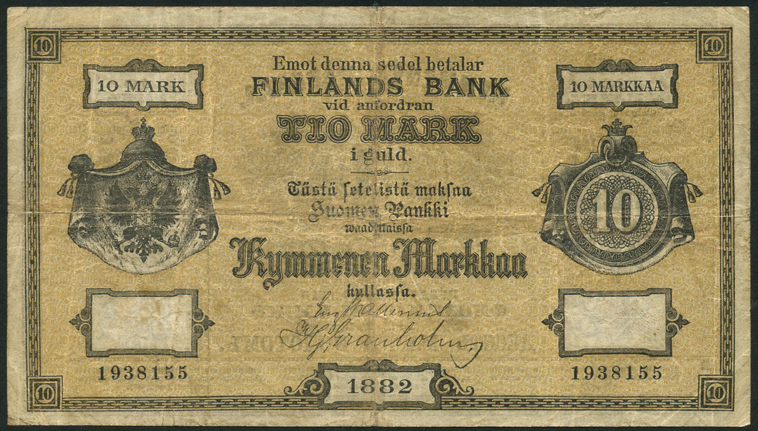 (x) Finlands Bank, 10 markkaa, 1882, serial number 1938155, black and yellow, value at right, coat of arms at left,