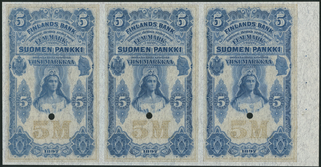 (†) Finlands Bank, a strip of three obverse proofs 5 Markkaa, 1897, no serial numbers, no signatures, blue and beige, maiden in wolfskin headdress at centre, arms at left, medallic female head at right, one punch hole in each proof
