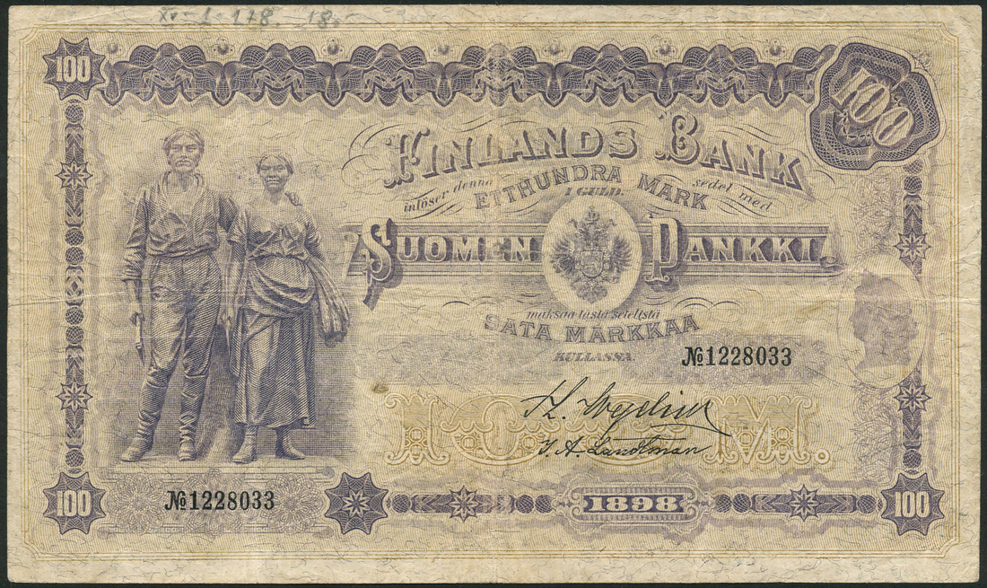 (x) Finlands Bank, 100 markkaa, 1898, serial number 1228033, lilac and beige, allegorical farming couple at left, 100M in pale brown underprint low right centre, arms at centre, medallic female head at right