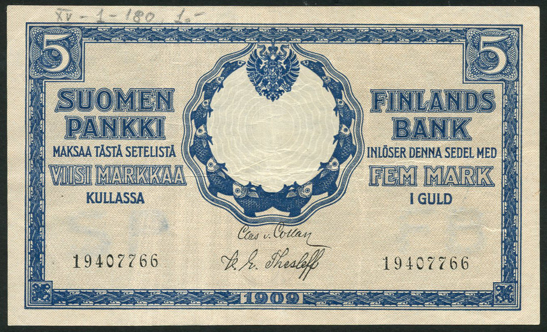 (x) Finlands Bank, 5 markkaa, 1909, serial number 19407766, blue, Czarist eagle at top centre, reverse row boat on river at centre about coat of arms, with watermark