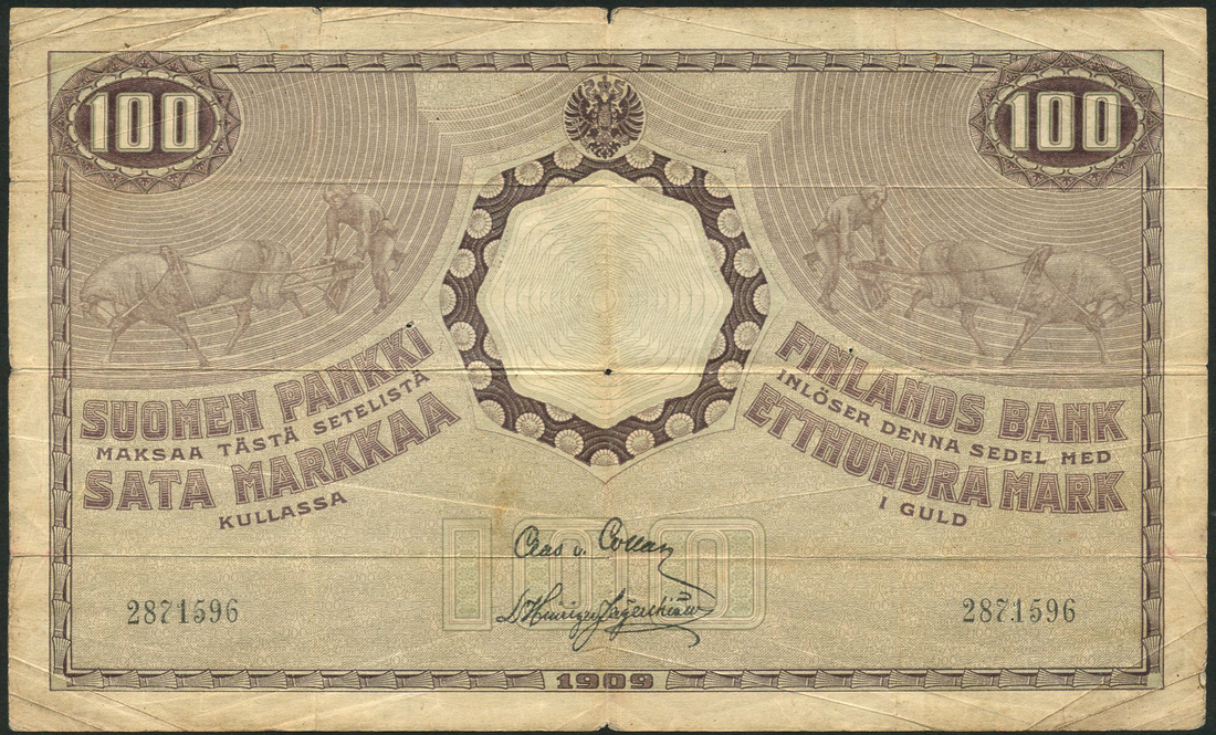 (x) Finlands Bank, 5 markkaa (2), 1909, serial numbers 2005690 and 2871596 violet, Czarist eagle at top centre, farmer ploughing at left and right, both without watermark