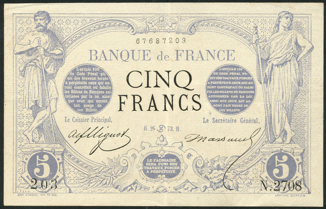 (x) Banque de France, 5 francs, 1873, serial number N2708-203, blue on white paper, allegorical figure at left and right, signatures of , reverse blue and white, three allegorical figures at centre, value top left and right