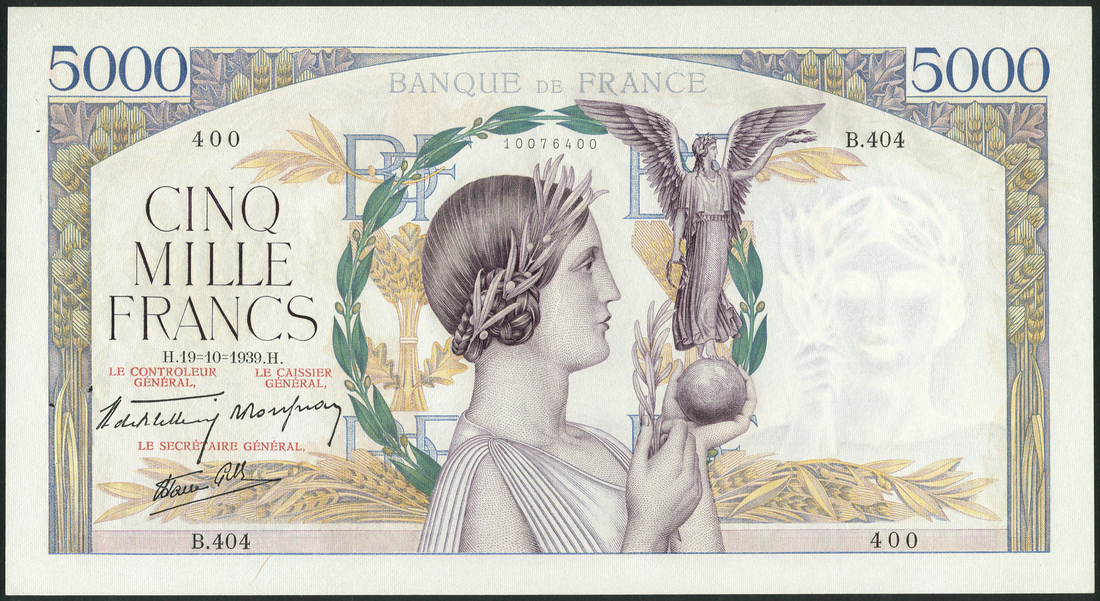 (x) Banque de France, 5000 Francs, 19 October 1939, prefix B.404, purple, green and yellow-brown, woman facing right, wearing headdress of laurel leaves representing victory and holding winged statue at lower centre, grain stalks and sheaf at left and right, reverse orange-brown, blue and grey-green, similar image but facing left