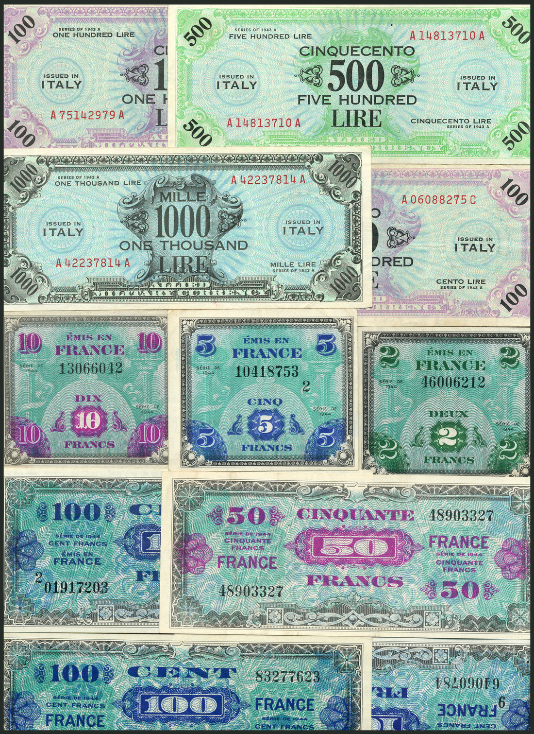a large group of Allied Military Currency, comprising, France, 5 francs (2), 10 francs, 50 francs (5), 100 francs (15), 500 francs, 1944, serial no. 03756312, blue and green, value in brown at centre and at left and right, reverse flag, also, Italy, 100 lire (3) series of 1943A, pale blue and lilac, red prefixes A-A, A-B, A-C, 1000 lire, 1943A, red serial number A42237814A, pale blue, and contemporary forgeries of 500 lire and 1000 lire (2), series of 1943A, and 500 lire, 1943a, red serial number A14813710A, pale blue and green, this group includes several notes perforated FALSO