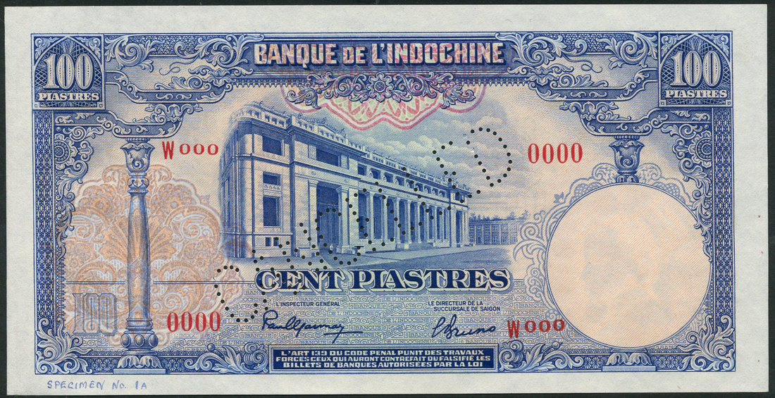 (†) Banque de l'Indochine, specimen 100 piastres (2), ND (1946), red serial number E000-0000 and W000-0000, blue and multicoloured, the Banque de l'Indo-Chine building at centre, Gannay and Bruno signatures, reverse blue