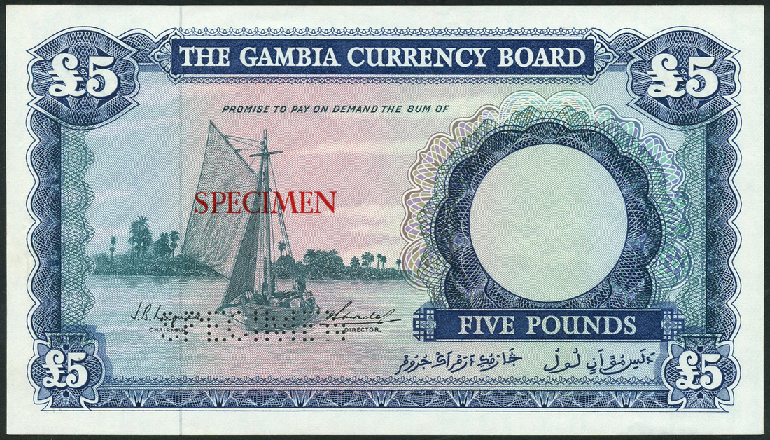 (†) Gambia Currency Board, specimen l0 Shillings, ND (1965), no serial numbers, green, sailing boat on River Gambia, reverse, rice harvesting; and specimen £5, no serial numbers, blue, sailing boat on River Gambia, reverse, milling machine, both overprinted SPECIMEN in red on obverse, perforated SPECIMEN