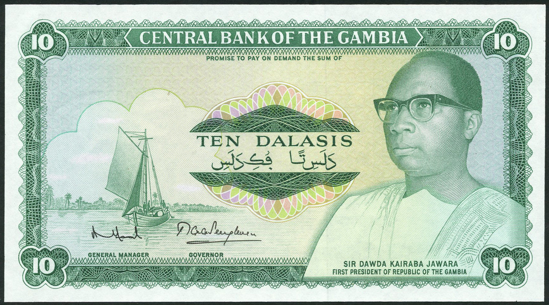 (†) Central Bank of the Gambia, a group of specimens and proofs for 10 dalasis, ND (1971 issue), comprising printers archival specimen, serial numbers G300001-H300000, bank specimen, zero serial numbers, a complete proof with no serial numbers, and stage proofs (4) for the obverse and reverse, each showing the various layers of printing, green on multicoloured underprint, President Dawda Kairaba Jawara at right