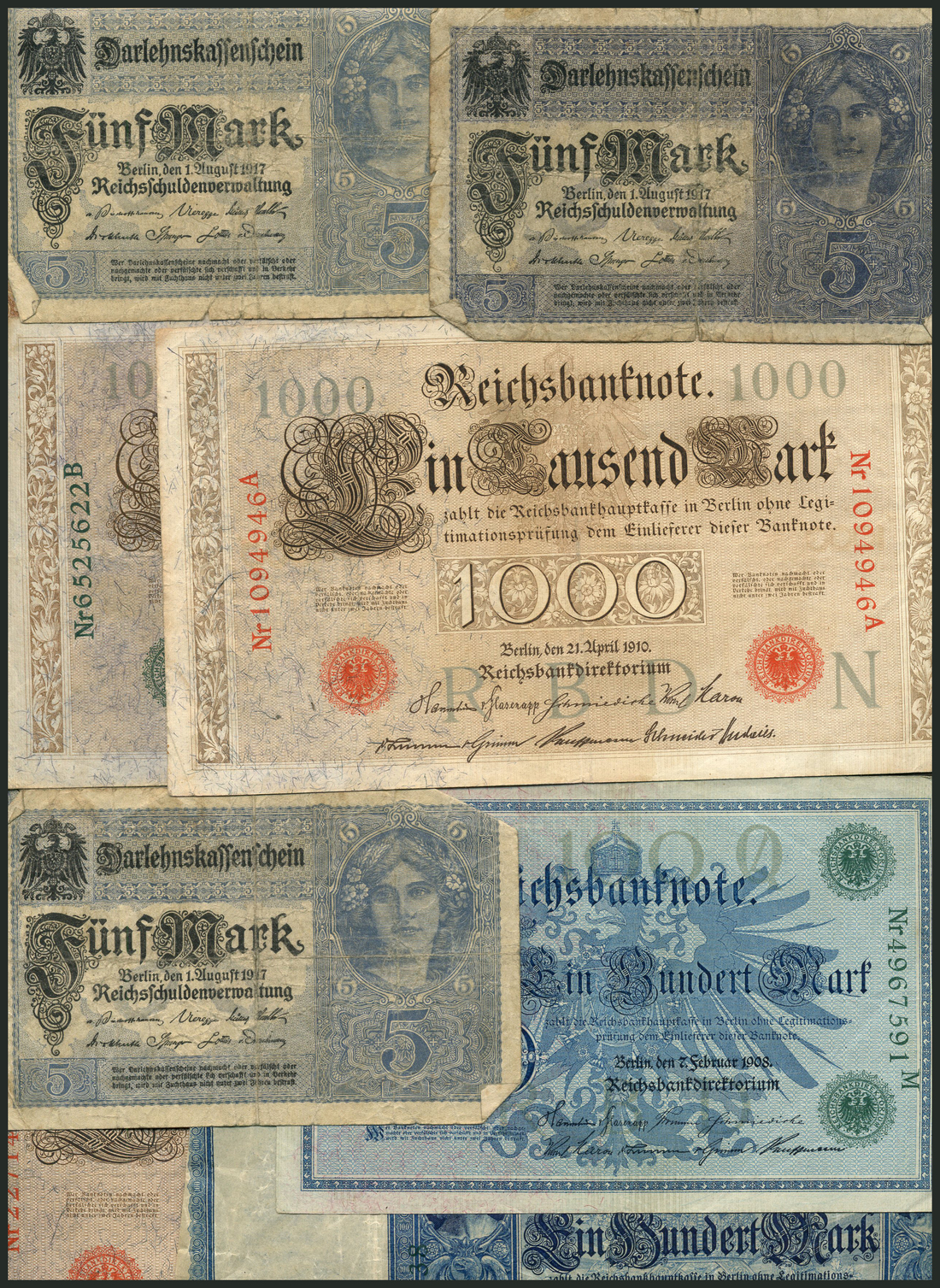 Reichsbanknote, a sizeable group of notes comprising, 100 marks, 7 February 1908, 1000 marks (4), 21 April 1910 (2 red serial numbers and 2 green serial numbers), 100 marks, 21 April 1910, 20 marks (4), 5 August 1914, 5 marks (7), 1 August 1917, 20 marks (9), 20 February 1918, 50 marks, 24 June 1919