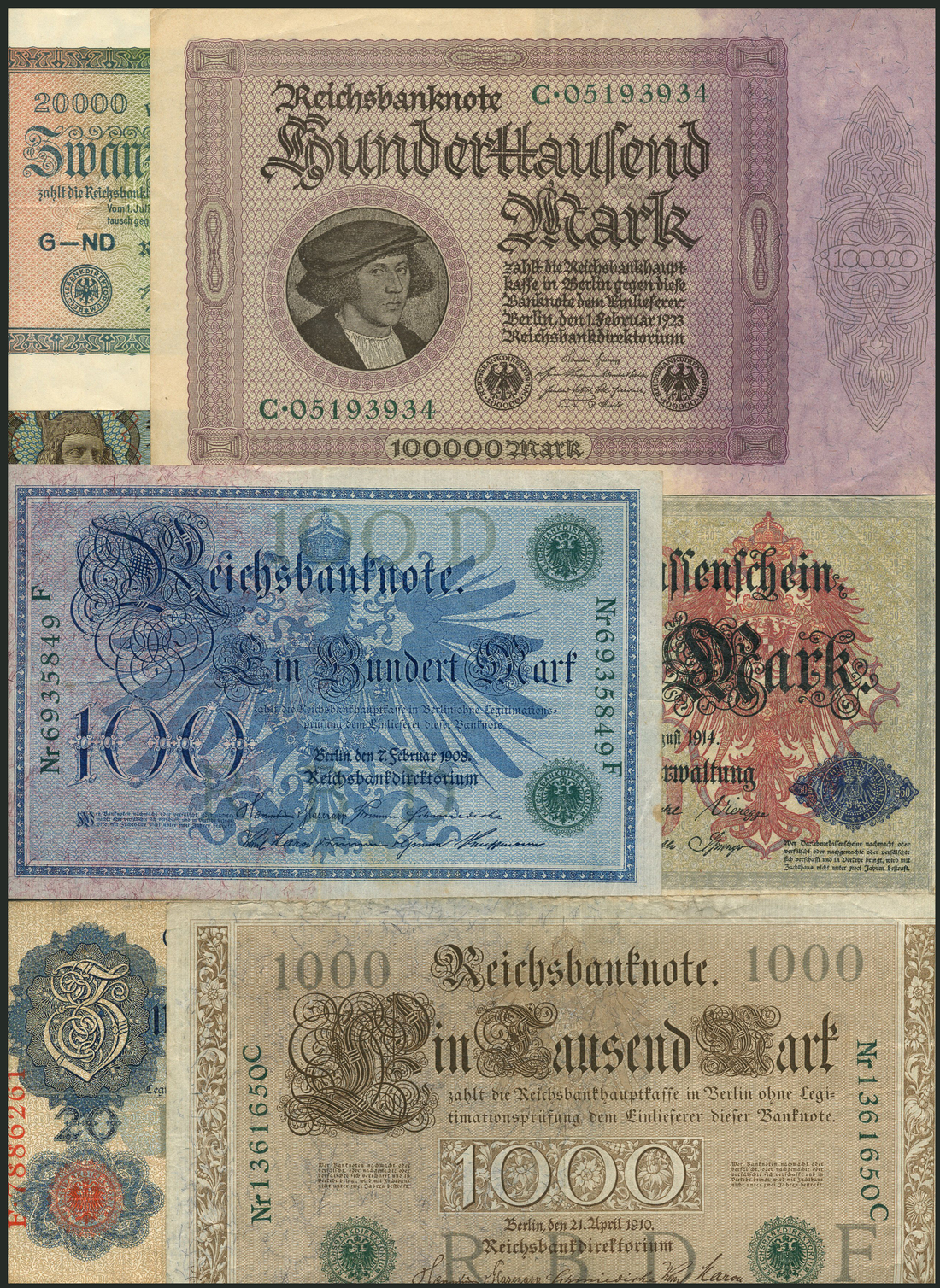 Reichbanknote, Imperial Bank Notes, a group comprising 100 marks, 1908, green serial (19), 20 marks 1910, 1000 marks, 1910, red and green serial number, 1 and 50 (7) mark, 1914, 20 marks, 1918, 5 marks, 1917, 50 marks, 1919 (2), 1 mark (6) and 100 marks, 1920, 20,000 and 100,000 marks, 1923