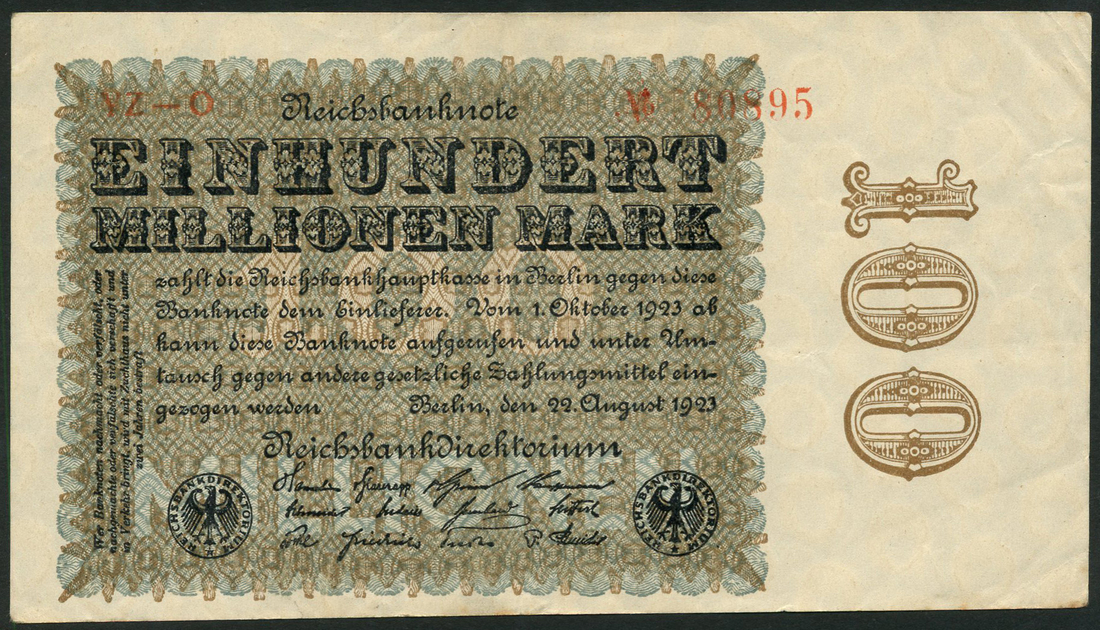 Reichsbanknote, Republic Treasury Notes, Germany, 100 millionen mark (2), 22 August 1923, uniface, black on blue green and olive underprint,