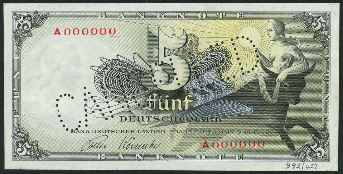 (†) Bank Deutscher Lander, specimen 5 Deutsche Mark (2), 9. 12. 1948, red serial no A 000000, black on green and yellow underprint, Europa on bull at right, reverse figure '5' in ornate guilloche,