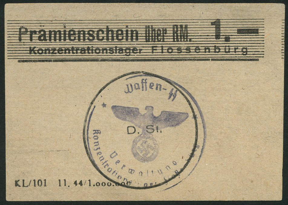 Flossenburg concentration camp, Germany, 1 reichsmark on card, 1944, black text on pale blue card, eagle and swastika stamp at centre
