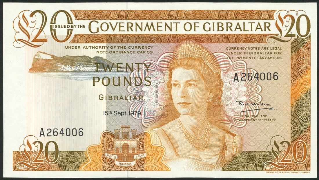 (x) Government of Gibraltar, £50 (3), 20 November 1975, serial number A000049, 15 September 1979, serial number A264006, 1 July 1986, serial number A643130, orange on multicolour, portrait Queen Elizabeth II at right, Rock of Gibraltar top left, reverse, Parliament House