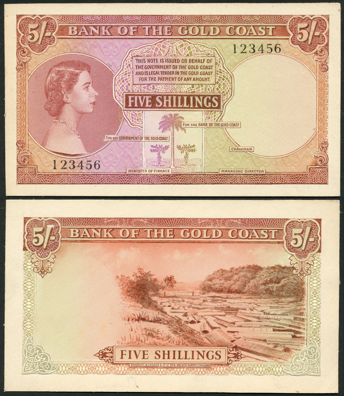 Bank of the Gold Coast, an obverse and reverse composite essay for a 5/-, ND (30 April 1953), serial number 123456, red-brown and lilac, young Queen Elizabeth II at left, palm tree low centre, value at centre, top left and right, reverse red-brown and pale green, logging scene