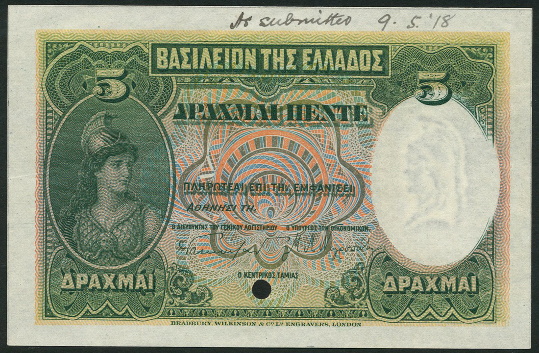 (†) Kingdom of Greece, Ministry of Finance, specimen proof 5 Drachmae, ND (1918), no serial numbers, green and multicoloured, Athena at left, reverse slate-purple and orange, coat of arms, one punch hole