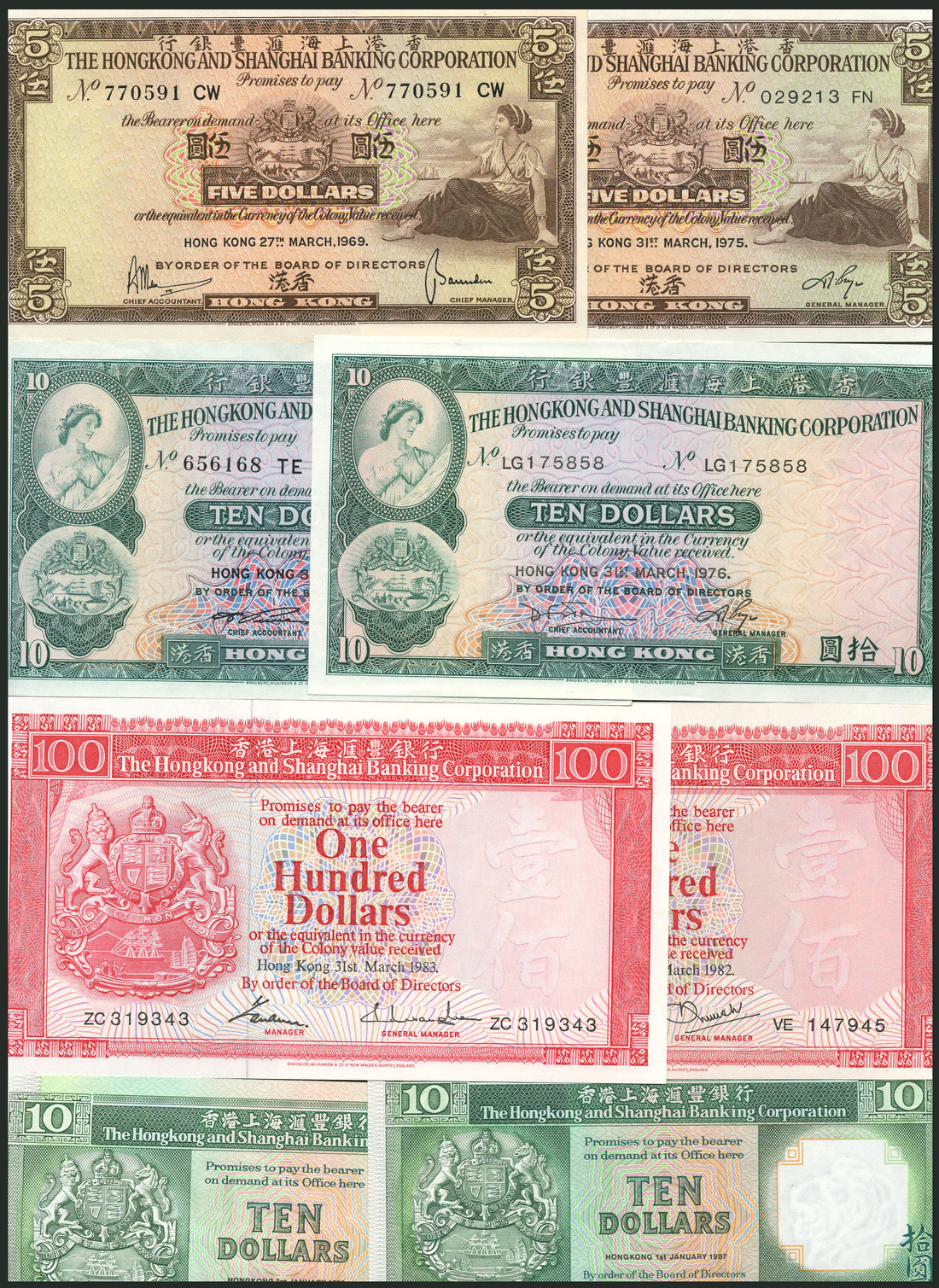 Hong Kong and Shanghai Corporation, a large group comprising, $5, 1969, 1973(2), 1975, $10, 1972, 1976, 1978, 1979, 1982, 1983, 1987, 1992 (7), $20, 1986, 1994 (3), $50, 1992, $100, 1983, 1988, 1990, 1991