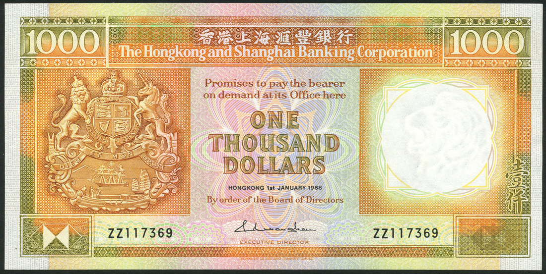 Hong Kong and Shanghai Banking Corporation, replacement $1000, 1 January 1988, serial number ZZ117369, orange, yellow and multicoloured, arms at left, value at centre and top left and right