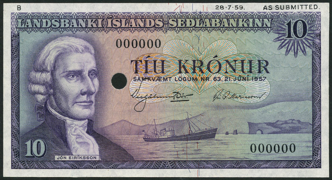 (†) Landsbanki Islands, specimen proof 5 Kronur, 21 June 1957, serial number A 000000, orange-brown, Ingolfur Arnarson at left, reverse grey-green, Bessastadir, the President of Iceland's official residence; also specimen proof 10 Kronur, 21 June 1957, serial number 000000, deep violet on pink and blue-green underprint, portrait of Jon Eiriksson at left, reverse violet, ships docked in Reykjavik harbour, aeroplane at top left, value at lower left and upper right, both one punch hole