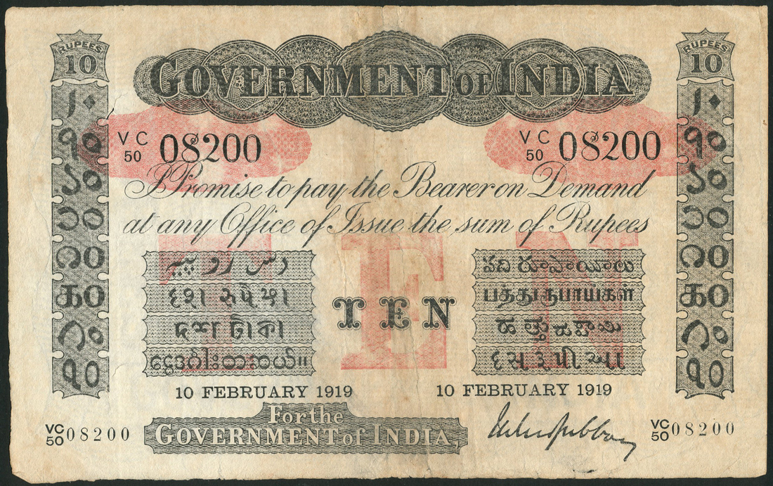 Government of India, 10 rupees, 10 February 1919, serial number VC/50 08200, black on white, value in pink underprint at centre, Gubbay signature