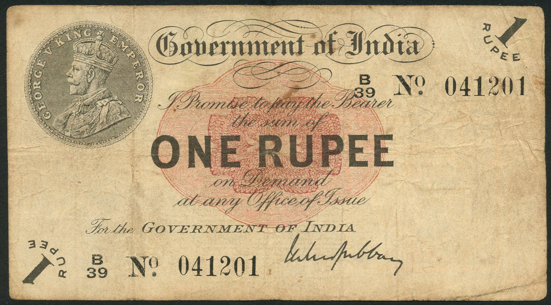 (x) Government of India, 1 rupee, ND (1919), serial number B39 041201, black on red underprint, portrait King George V at top left, value low left, centre and top right