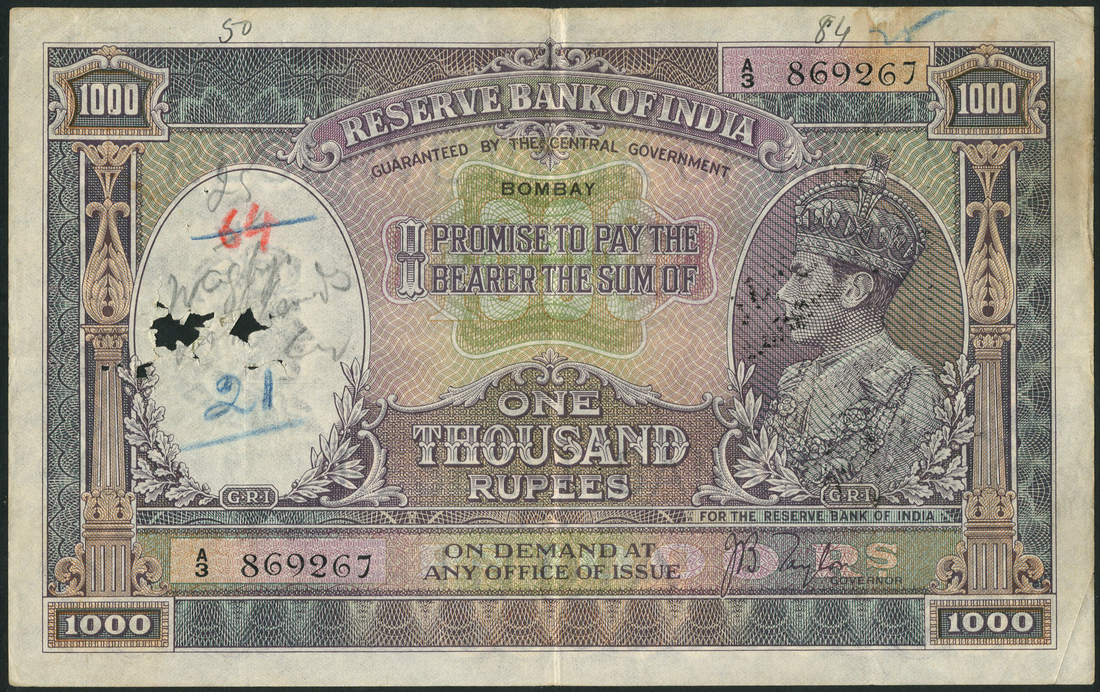 Reserve Bank of India, 1000 rupees, Bombay, ND (1938), serial number A/3 869267, purple and green, George VI at right, Taylor signature, reverse purple, mountains at centre