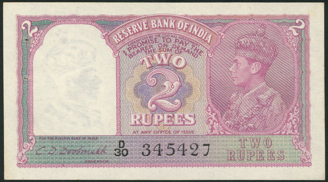 (x) Reserve Bank of India, 2 rupees, ND (1943), serial number D30 345427, pink on multicolour, 10 rupees (3), ND (1937), serial numbers B67 681259, B88 553669 and C79 884339, blue and olive green, Government of Pakistan, 10 rupees, ND (1943), serial number H49 061260, purple and multicolour, all portrait King George VI at left