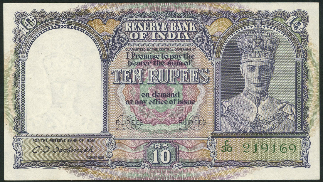 Government of India, 5 rupees, ND (1943), serial number A/84 059032, 10 rupees, ND (1943), serial number C/30 219169, green and multicolour and purple and multicolour respectively, portrait King George VI at right, both Deshmukh signature