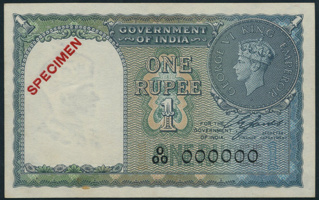 (x) Government of India, specimen 1 rupee, ND (1940), serial number O/00 000000, green on multicolour underprint, George VI in coin at top right, value at centre and top left and right, red SPECIMEN overprint at top left