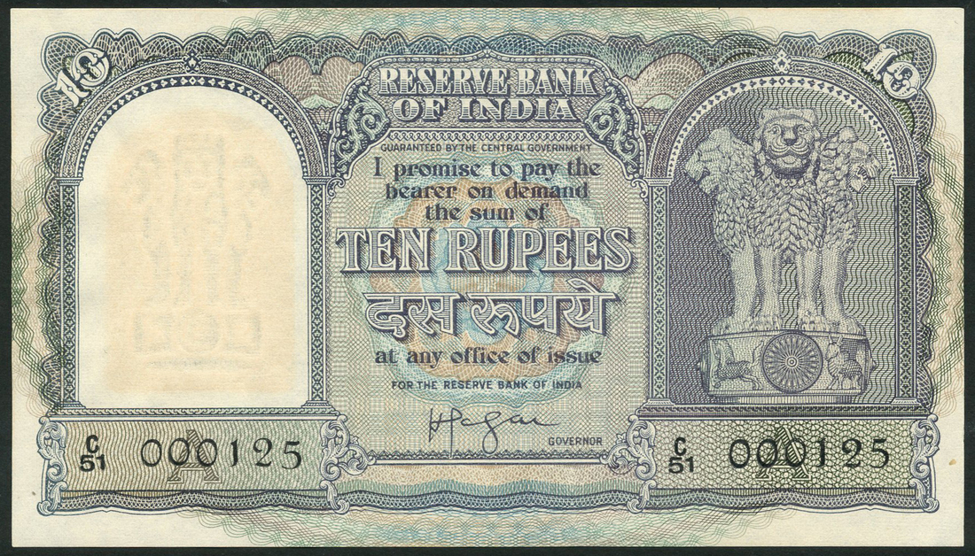 (†) Reserve Bank of India, 10 Rupees, 1958, serial number C/51 000125, pale blue-grey on multicolour underprint, Asoka column at right, Lengar signature