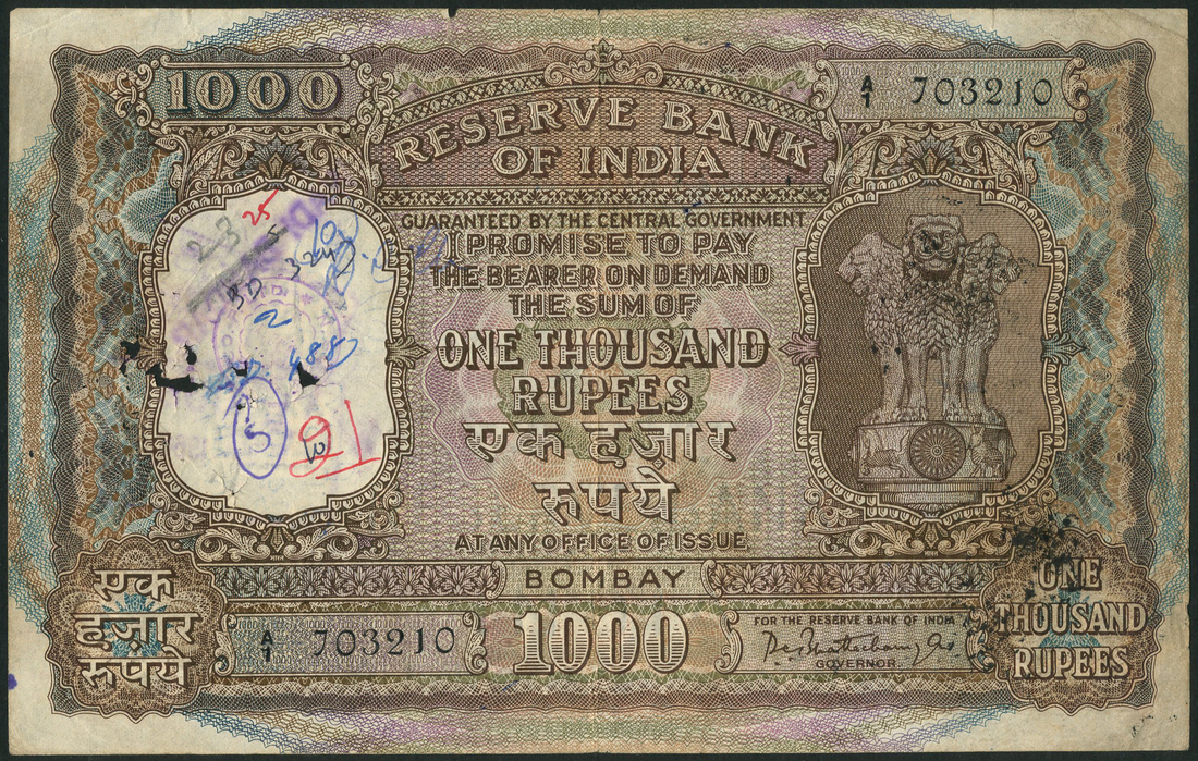 Reserve Bank of India, 1000 rupees, Bombay, ND (1964), serial number A/1 703210, P.C Bhattacharya signature, brown on multicolour underprint, text in English and Hindi, Asoka column at right