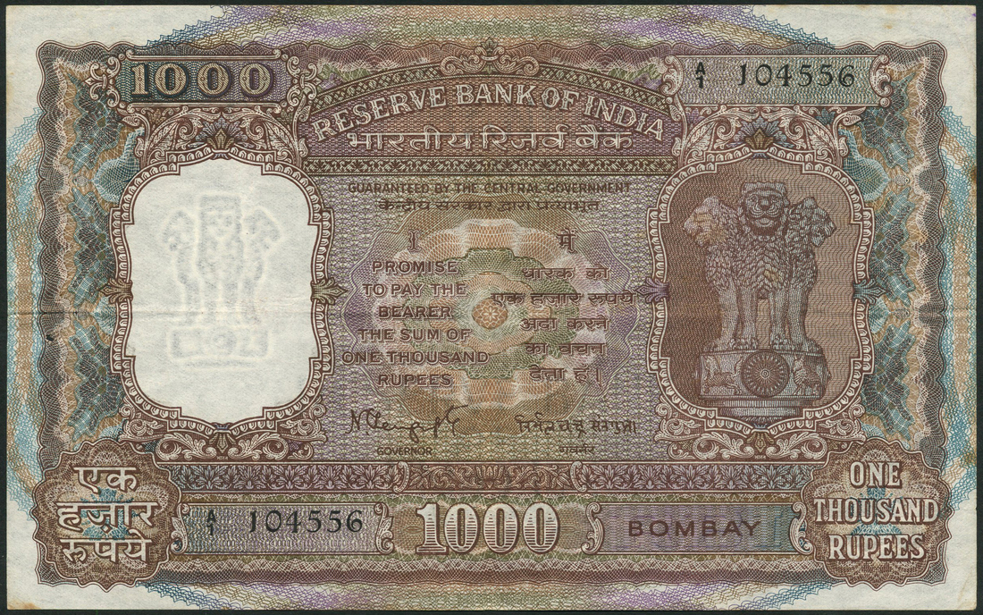 (x) Reserve Bank of India, 1000 rupees (2), ND (1975), Bombay, serial numbers A1 104556 and A1 385935, brown on multicolour underprint, text in English and Hindi, Asoka column at right, reverse, temple at centre