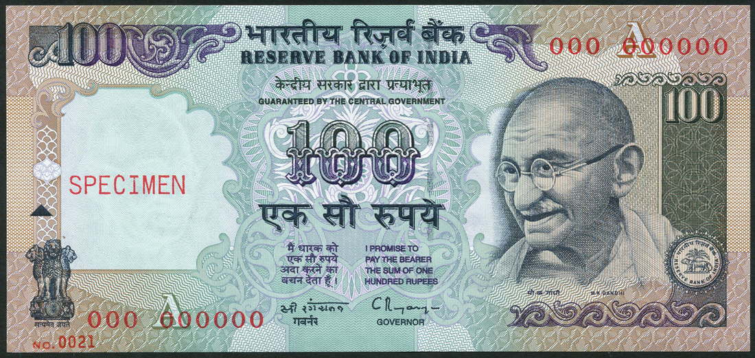 Reserve Bank of India, specimen 100 rupees, ND (1996), red zero serial numbers, purple and dark green on multicolour underprint, Gandhi at right, Asoka Column at low left, reverse Himalaya Mountain view, red SPECIMEN overprint