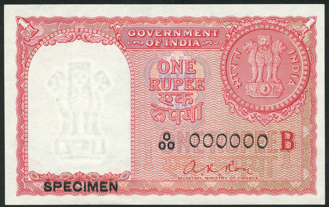 (†) Gulf Rupees (Oman, Bahrain, Qatar and the Trucial States), specimen 1 rupee, ND (1959), serial number 0/00 000000, red and mauve and pale orange, for the Government of India, Ashoka pillar at top right, signature of A.K.Roy low right, reverse red, 1 rupee coin top left