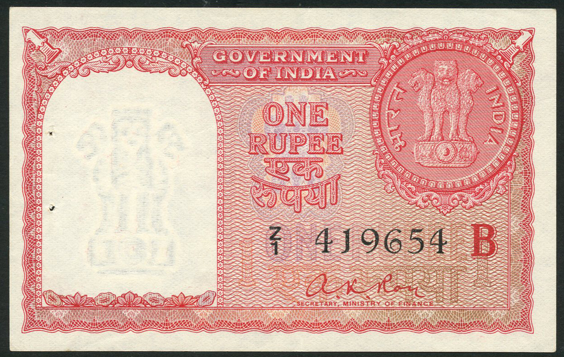 (x) Government of India, 1 rupee, ND, prefixes Z/1, Z/2, Z/10, red, coin with Asoka column at right, watermark at left, A. K. Roy signature variety,