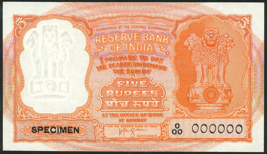 (†) Gulf Rupees (Oman, Bahrain, Qatar and the Trucial States), specimen 5 rupees, ND (1959), serial number 0/00 000000, orange and mauve, for the Reserve Bank of India, Ashoka pillar at right, signature of H.V.R.Lengar low right, reverse orange and mauve, Indian Blackbucks low left, value and seal in field