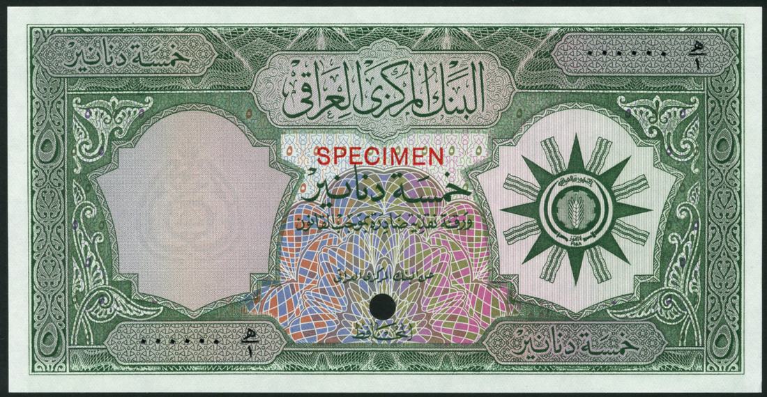 (†) Central Bank of Iraq, colour trial 5 dinars, 1958, zero serial numbers, green and multicoloured, arms at right, reverse green, Hammurabi receiving the scrolls, value at left and at each corner, also a specimen 5 dinars, red and multicoloured, as previous but signature of Nadhim al-Zahawi