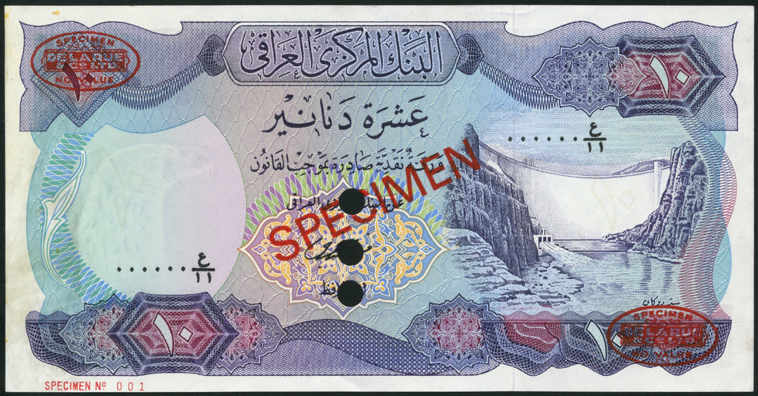 (†) Central Bank of Iraq, Republic Issue, specimen 1/4,1/2,1,5 and 10 dinars, ND (1973), all with zero serial numbers, green, purple and multicoloured, blue, red and purple respectively, Grain silos, cement factory, Aldora oil refinery, National Parliament building and the Dukan Dam respectively, all signature of Fawzi al-Kaissi at right