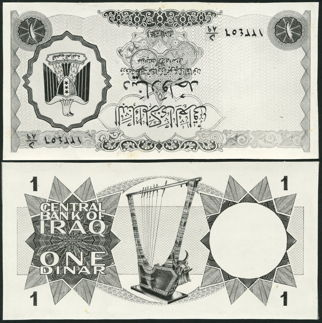 Central Bank of Iraq, four pairs of obverse and reverse printers archival photographs for 1 dinar, ND (c1959-60), black and white, two formats, all with arms of the Republic of Iraq at right, reverse of the first format with scientist at left, oil refinery at centre, second format with ancient bull-headed harp at centre