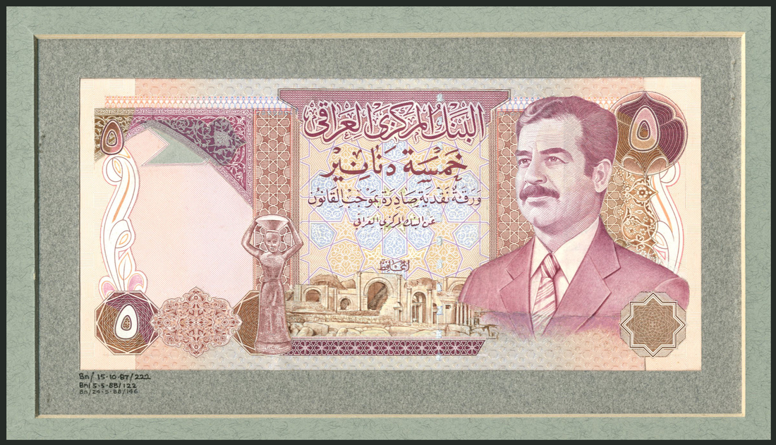 (†) Central Bank of Iraq, an obverse and reverse printers archival composite essay on board for a proposed issue of 5 dinars, ND (1980's), no serial numbers, purple and multicoloured, Saddam Hussein at right, statue and ruins low centre, value low left and top right, reverse purple and brown, hall by water at centre, vase with falcon lid at left, value at each corner
