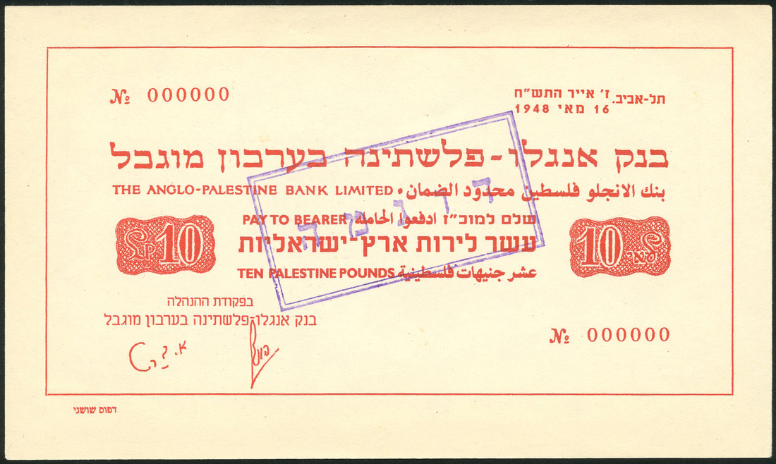 (x) Anglo-Palestine Bank Limited, a group of trial/specimens for the 1948 issue, comprising 500 mils, £1, £5 and £10, all orange on cream paper, zero serial numbers and purple DUGMA overprints