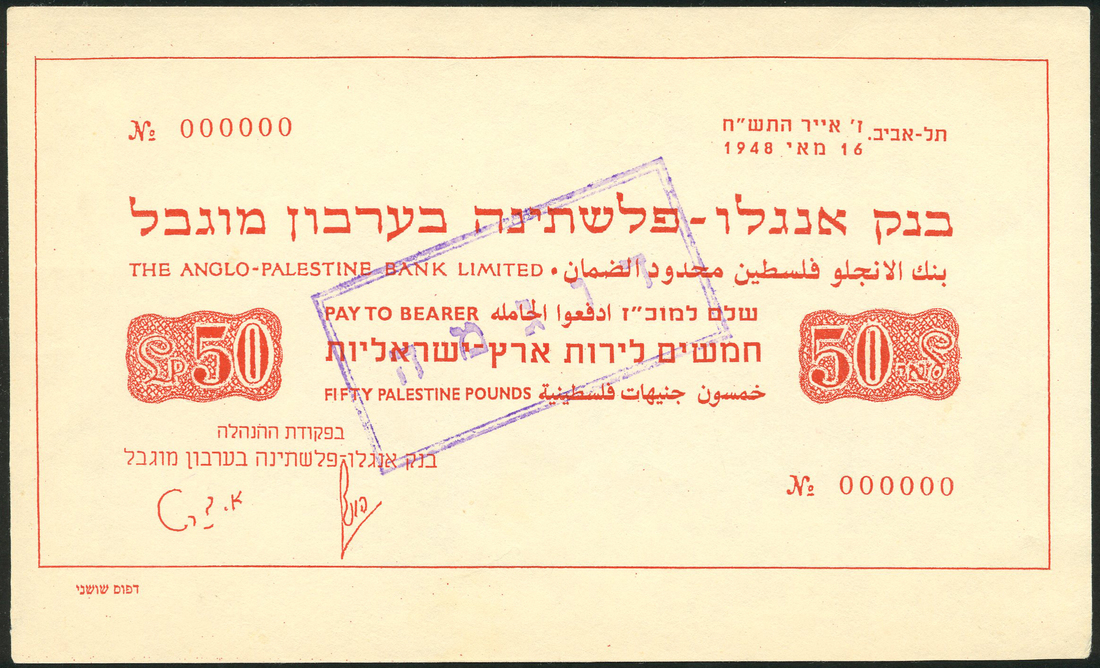(x) Anglo-Palestine Bank Limited, trial/specimens £50, 1948 issue, orange on cream paper, zero serial numbers and purple DUGMA overprint
