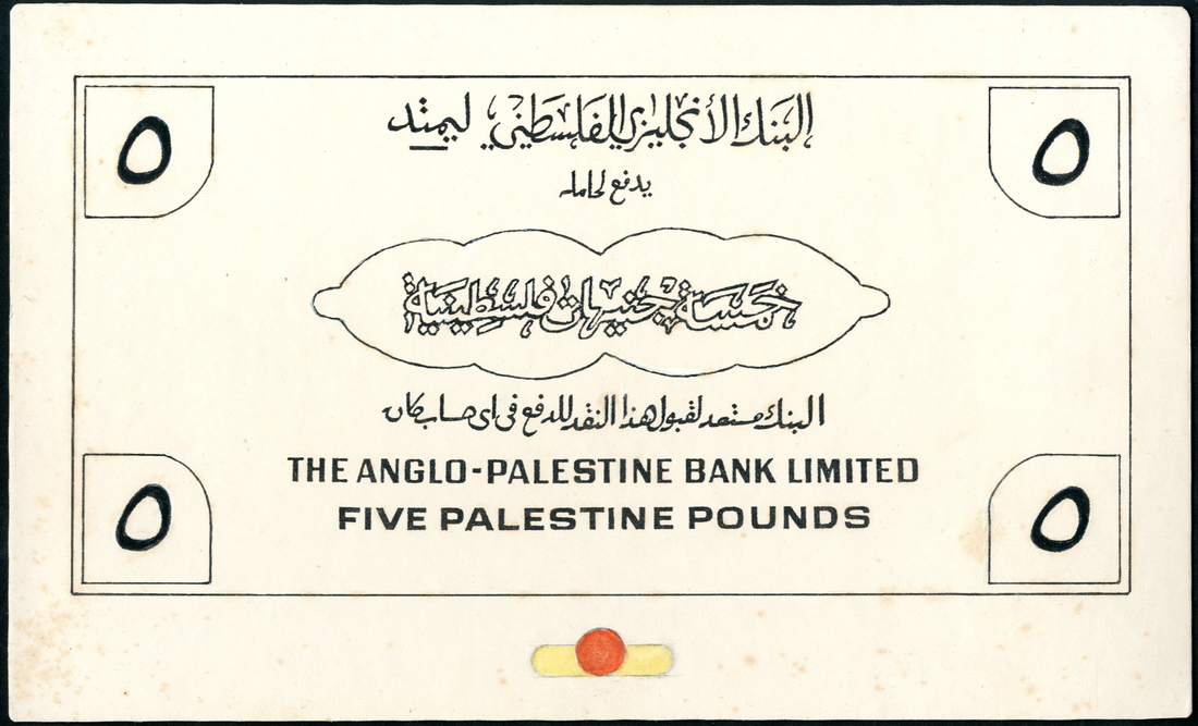 (x) Anglo Palestine Bank Limited, hand executed reverse proof for £5, ND (c.1948), black text on cream board, red and yellow colour bar at low centre, value at each corner
