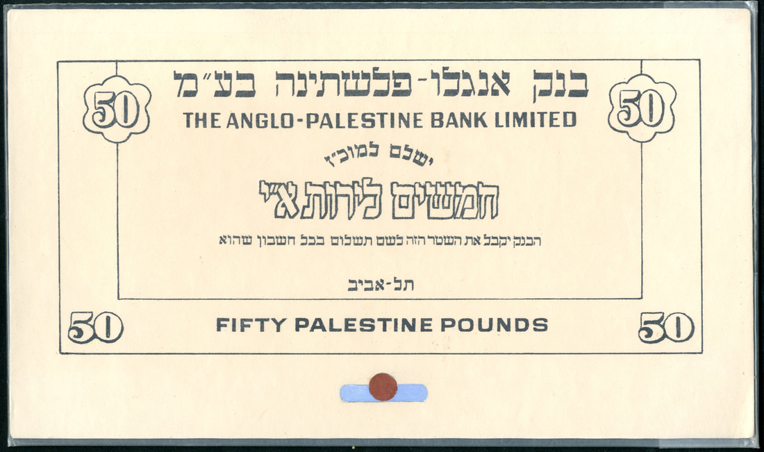 (x) Anglo Palestine Bank Limited, hand executed reverse proof for £50, ND (c.1948), dark grey text on cream board, red and blue colour bar at low centre, value at each corner