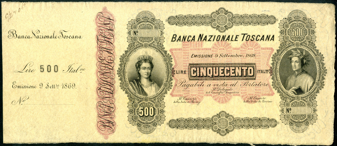 (†) Banca Nazionale Toscana, specimen 500 lire, 9 September 1869, black, pale brown, bank title and value in pale pink panels, turreted female head (Italia) at left, Dante laureate at right, value in field, counterfoil at left, reverse pink and pale brown, value inverted at centre