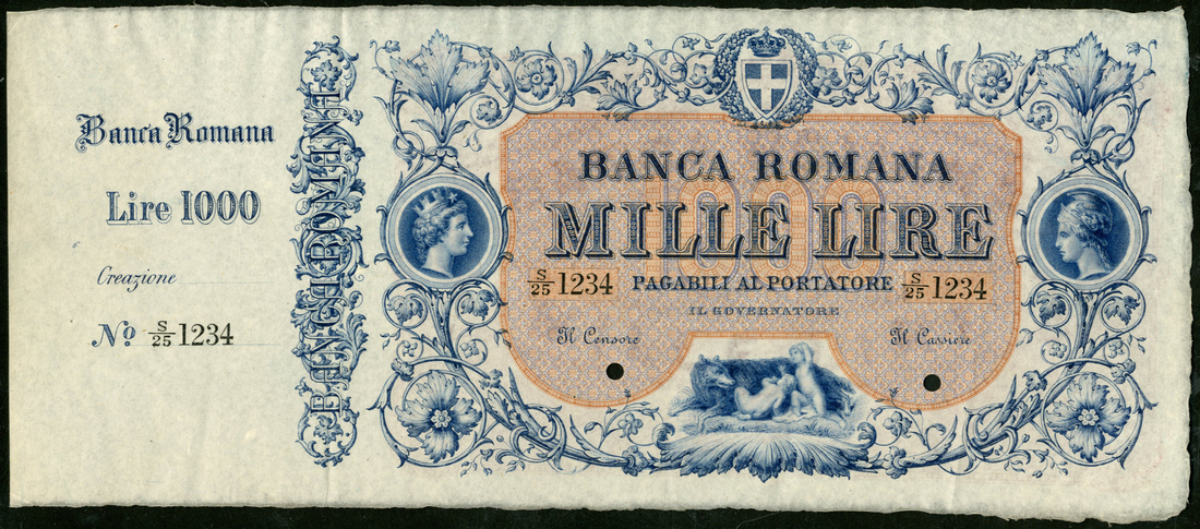 (†) Banca Romana, Italy, specimen 1000 lire, ND (1872), serial number S/251234, grey blue and pink on cream paper, crowned and helmeted figures in circular frames at left and right, Romulus and Remus with she wolf low centre, arms top centre, ornate border, reverse, pink