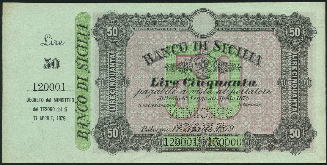 Il Banco di Sicilia, printer's archival specimen 50 Lire with counterfoil, Palermo, 11 April 1879, serial number run 120001 to 130000, black and green on rose underprint, bank seal at upper centre, value at centre and in guilloches in each corner, reverse value at left and right and at upper and lower centre, perforated SPECIMEN BW&Co LONDON