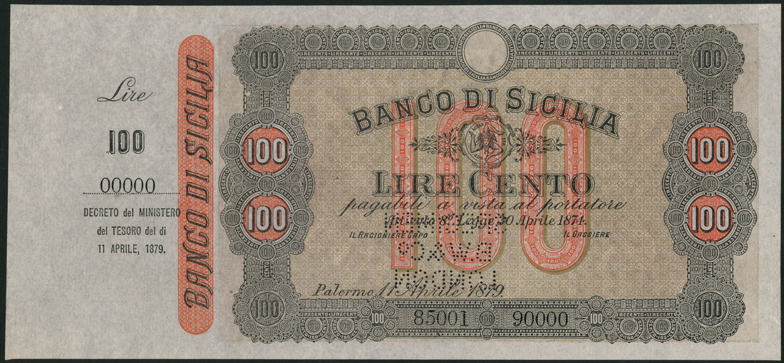 Il Banco di Sicilia, printer's archival specimen 100 Lire with counterfoil, Palermo, 11 April 1879, serial number run 85001 to 90000, black and red on brown underprint, bank seal at upper centre, value at centre and in guilloches in each corner, reverse brown and rose, value at centre and at left and right, perforated SPECIMEN BW&Co LONDON