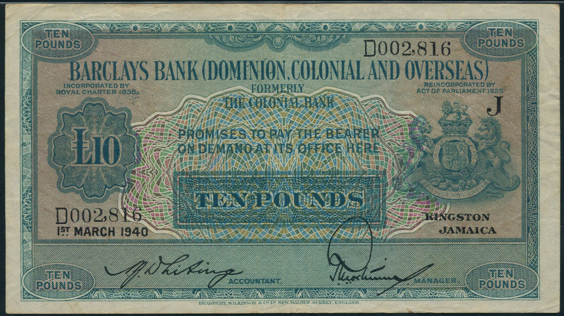 (x) Barclays Bank, (Dominion, Colonial and Overseas), Jamaica, £10, 1 March 1940, serial number D002,816, black on blue and multicolour underprint, bank title top centre, arms at right, reverse bank title, value right and left, arms at centre