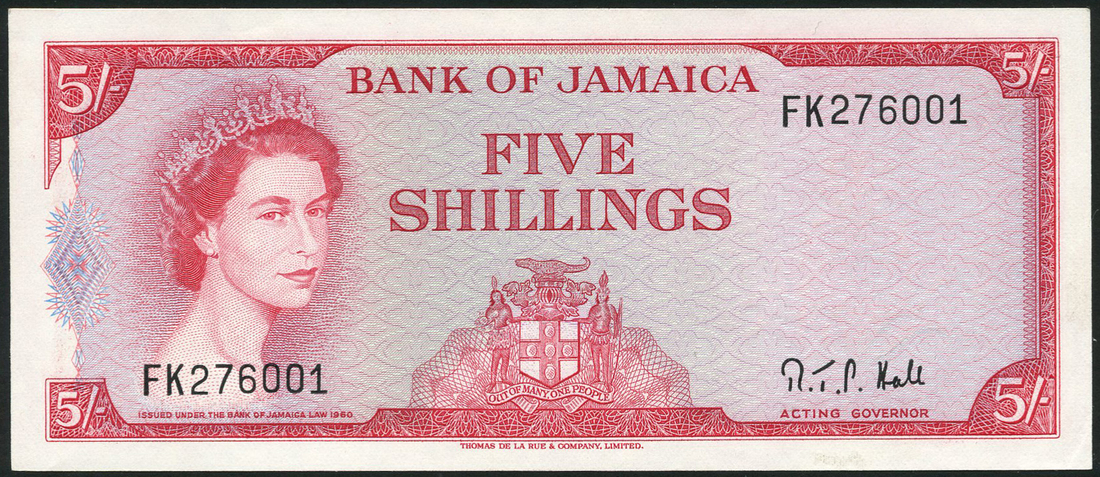 Bank of Jamaica, 5 shillings, ND (1960), serial number FK276001, red on pale multicolour underprint, portrait Queen Elizabeth II at left, value in each corner and at centre, arms low centre, reverse, bank title top centre, waterfall, also, $20, ND (1976), serial number H401829, maroon on multicolour underprint, Noel. N. Nethersole at left, national flag at centre, arms at low centre, value at each corner, Brown signature