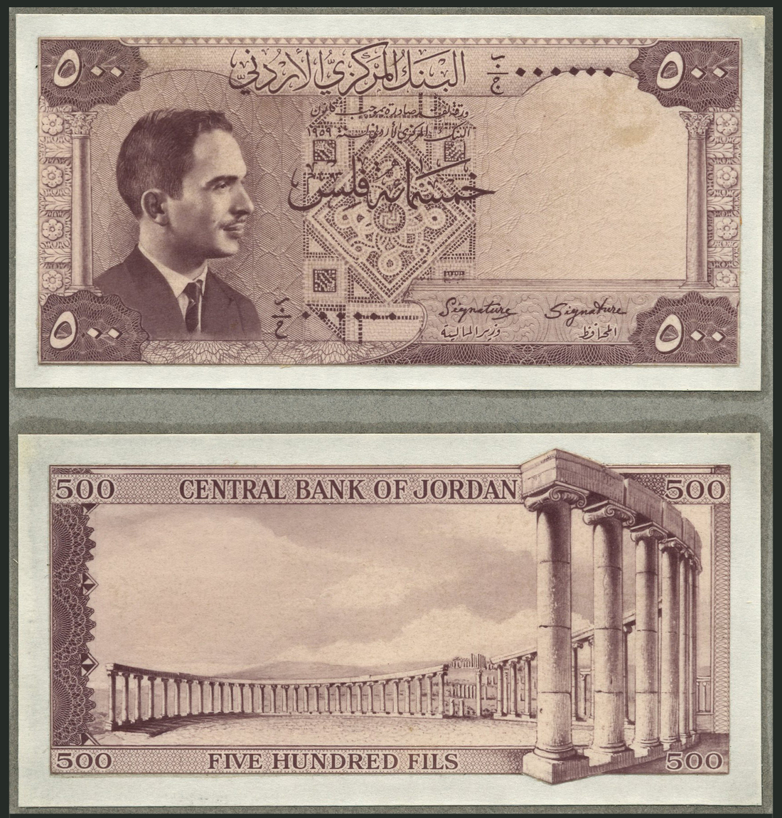 (†) Central Bank of Jordan, a printers archival obverse and reverse photographic proof on board for a 500 fils, 1959, zero serial numbers, purple, King Hussein at left, mosaic background, reverse purple, columns at Jerash